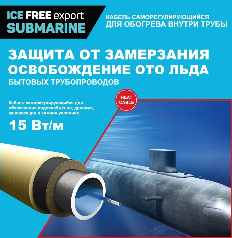 Секция нагревательная саморегулирующая кабельная ICE FREE export SUBMARINE предназначена для внутренней защиты от замерзания бытовых трубопроводов, обеспечения их сохранности, освобождения ото льда, качественной и надежной работы, стабильного водоснабжение и дренажа.